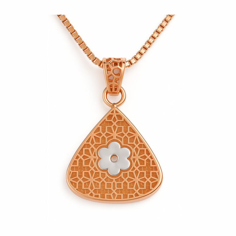 The 925 Silver Rose Gold Pendant-Chain with Platinum Flower Center is a graceful blend of contrast and craftsmanship. Made from premium 925 sterling silver, the pendant is finished in a warm rose gold polish and accented with a beautifully detailed platinum-toned flower center, symbolizing purity, harmony, and timeless elegance.