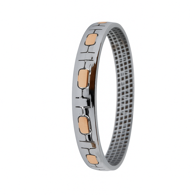 The Aureum Grid Kada is a fusion of masculine strength and sophisticated style. Meticulously designed in 925 sterling silver, this kada features a polished band highlighted with rose gold rectangular inlays, giving it a striking two-tone appeal. The subtle geometric engravings enhance its modern character, making it a statement piece for the contemporary man.